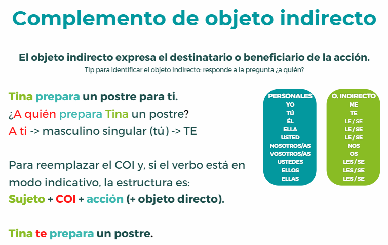 But there is also the indirect object complement, which is expresses the recipient or beneficiary of the action. Tip for identifying the indirect object: answer the question "to whom? For example: